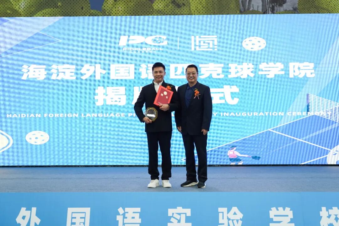 ▲海淀外国语教育集团执行总裁胡雄一为匹克球学院院长陈义聪颁发聘书