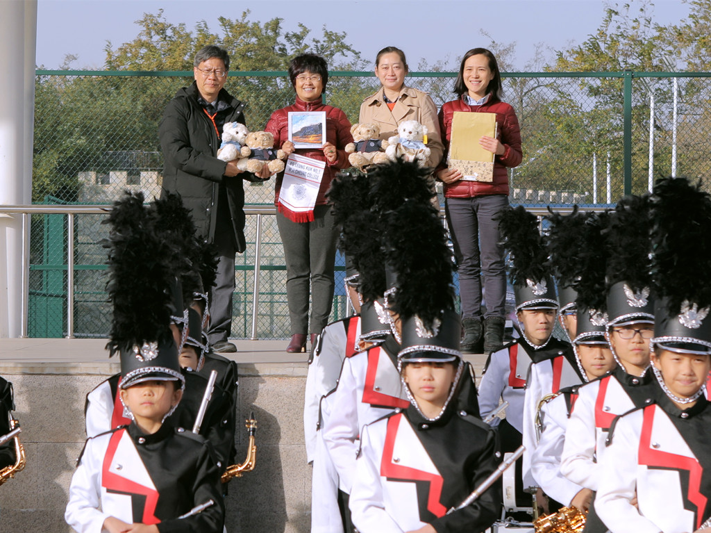 上午9时许,在小学行进管乐团的伴奏下,国旗冉冉升起,刚刚到达“海外”的香港师生参观了小学部的升旗仪式。香港保良局第一张永庆中学校长周楚成、北京市东城区团委副书记关丽丽与我校校长黄瑞华共同出席了升旗仪式。随后黄瑞华校长与来宾互赠礼物,香港保良局第一张永庆中学校长周楚成致答谢辞。
