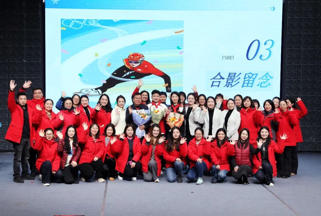 两位短道速滑冠军、“海贝灵芯”及校领导们合影留念。