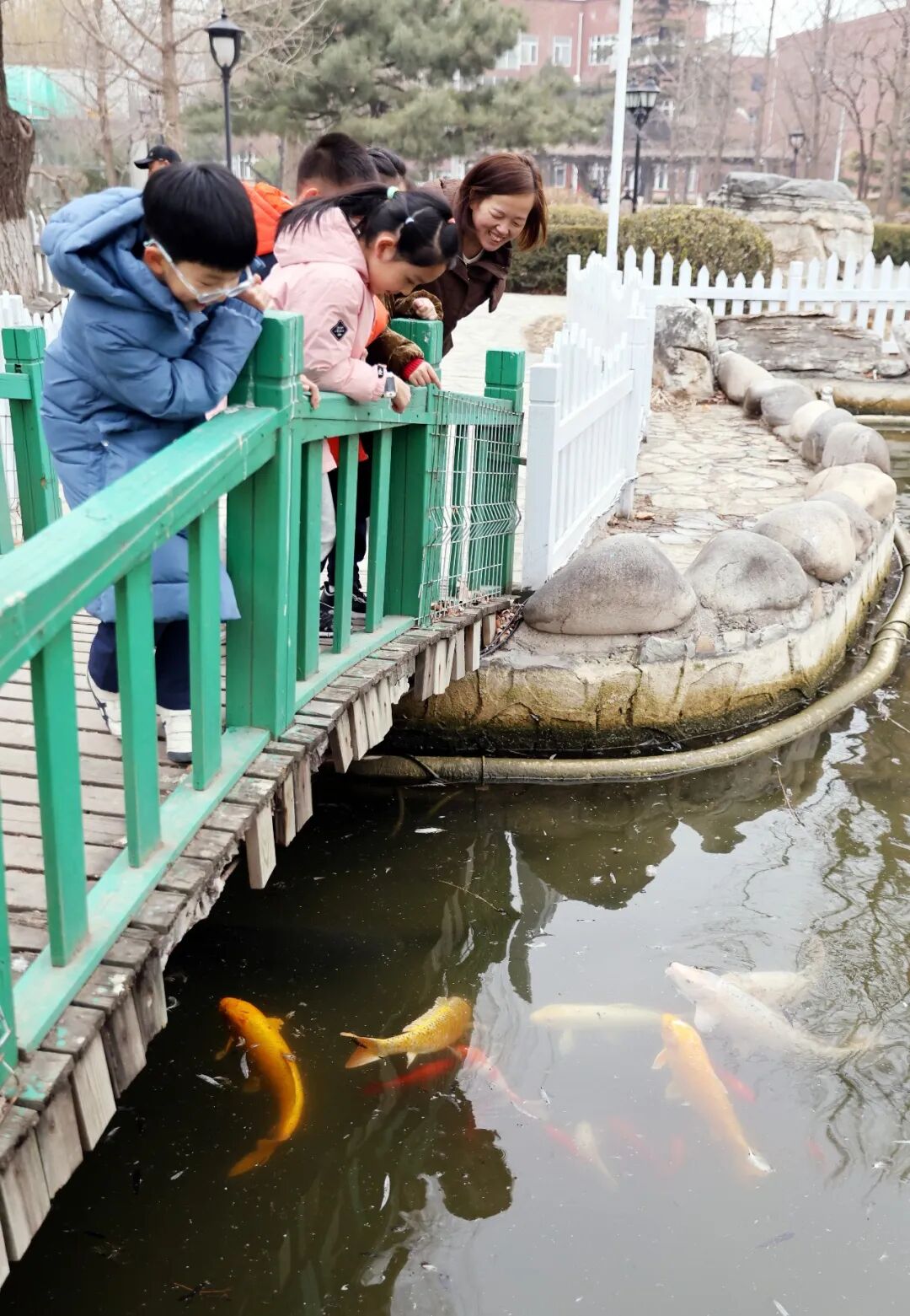 孩子们隔着围栏打招呼