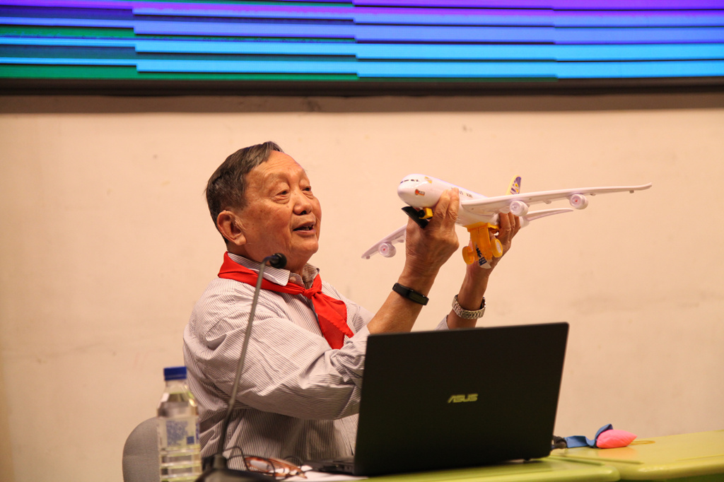 精彩课堂开始啦!陈光爷爷先就“趣谈航空知识”这一话题与同学们进行了互动,大家争先恐后地举手分享自己了解的知识。“飞机为什么会飞?”“飞机场的跑道为什么要那么长?”“飞机能直上直下飞吗?”同学们带着这样的思考认真聆听着陈光爷爷的讲授。在讲座中,陈光爷爷向同学们介绍了国产飞机的特点和作用,并利用有趣的气球实验帮助大家更好地理解有关飞机的知识和原理。同学们听得津津有味,会场不时响起掌声与欢笑声。